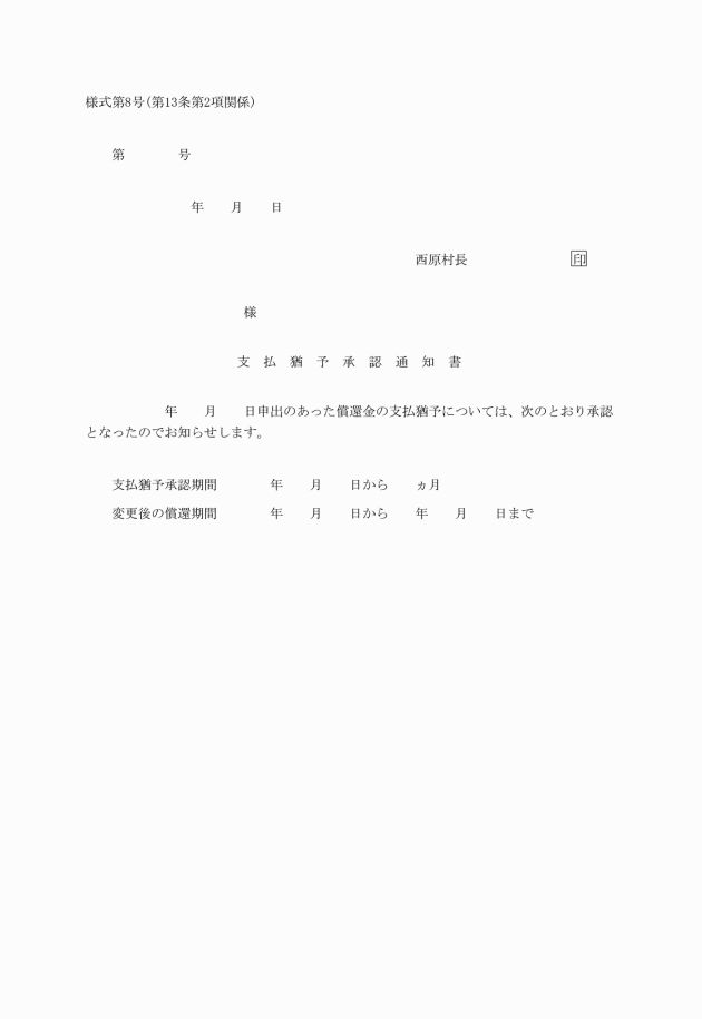 2 村長は、支払の猶予を認める旨を決定したときは、支払を猶予した期間その他村長が必要と認める事項を記載した支払猶予承認通知書(様式第8号)を、当該借受人に交付するものとする。