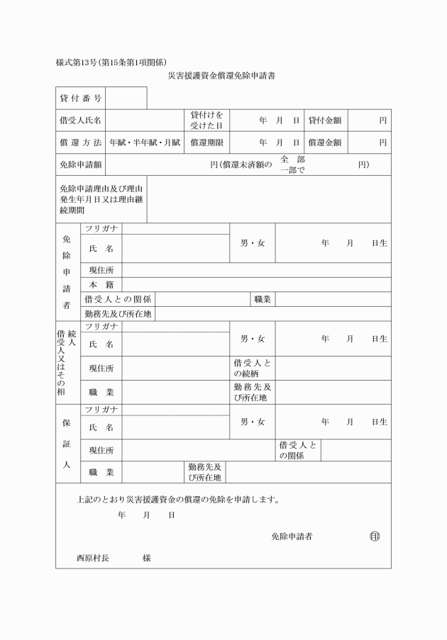 第15条 災害援護資金の償還未済額の全部又は一部の償還の免除を受けようとする者(以下「償還免除申請者」という。)は、償還免除を受けようとする理由その他村長が必要と認める事項を記載した申請書(様式第13号)を、村長に提出しなければならない。