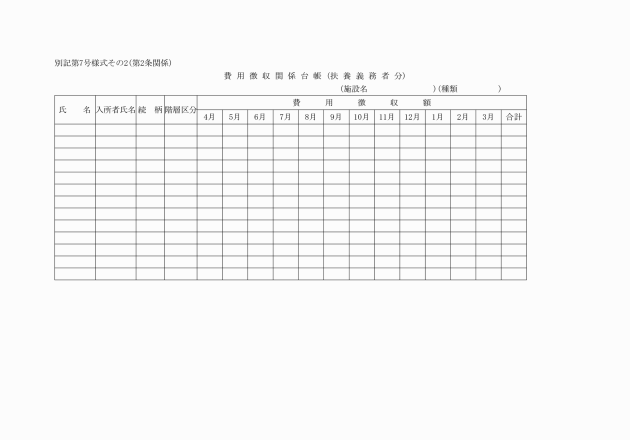 第10条 費用徴収については、老人保護措置費の国庫負担について(昭和47年6月1日厚生省社第451号厚生省事務次官通知)第2国庫負担金の算定基準における別紙2「費用徴収基準」に定める基準により、法第11条の規定による措置に要する費用の全部又は一部を、当該措置を受けた者及びその主たる扶養義務者から徴収する。