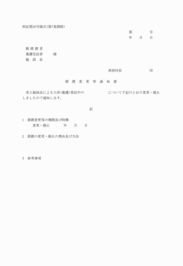 第7条 村長は、老人ホームへの入所又は養護受託者への委託の措置を受けている者(以下「入所者等」という。)の状況について、年1回以上見直しをすることとし、法に基づく他の措置をとることが適当であると認められる場合は、当該他の措置に変更するものとする。