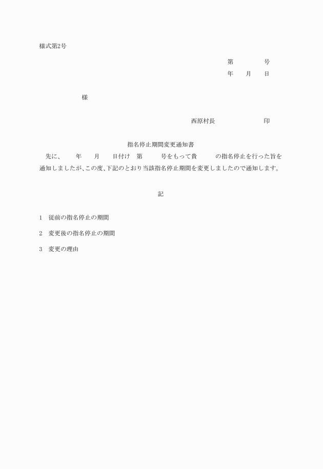 2 村長は、前項の規定により指名停止の通知をする場合において、当該指名停止の事由が村工事等に関するものであるときは、必要に応じて改善措置の報告を徴するものとする。