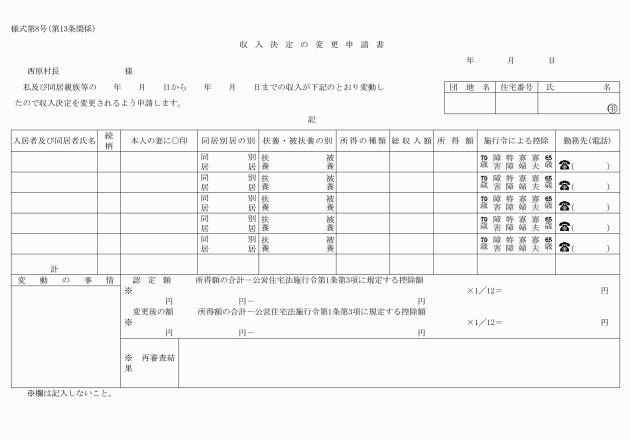 第11条 入居者が条例第26条ただし書又は第28条第1項ただし書の規定により承認を受けようとするときは、次の各号に掲げる承認、許可申請書を村長に提出しなければならない。