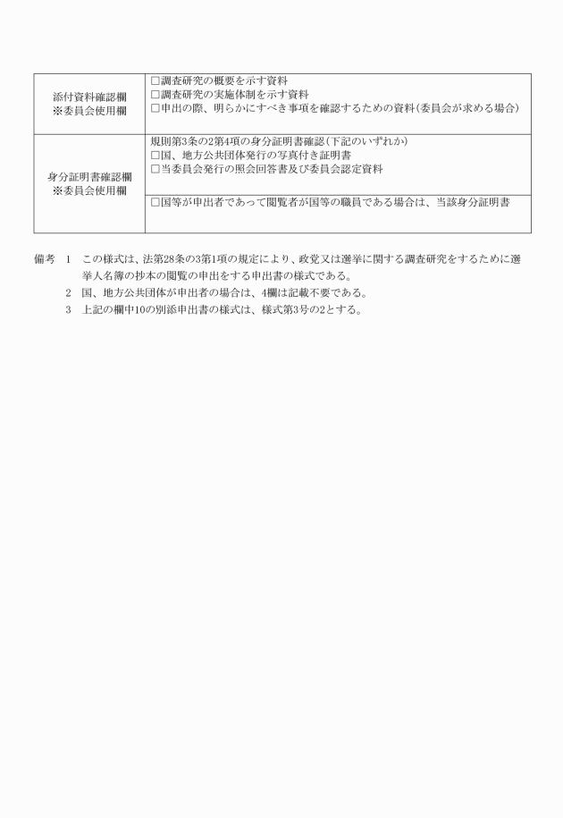 3 国又は地方公共団体、法人若しくは個人がする法第28条の3第1項に規定する政治又は選挙に関する調査研究を目的とする閲覧については、選挙人名簿抄本閲覧申出書(調査研究)(様式第3号)により規則第3条の3第2項に規定する書類を添えて申出なければならない。