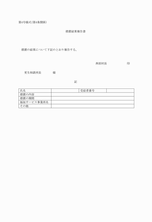 第5条 村長は、法第15条の4及び第16条第1項第2号の規定による委託をしようとするときは、障害福祉サービス等委託依頼書(第5号様式)により、当該委託をしようとする障害福祉サービスを行う事業所又は障害者支援施設等若しくはのぞみの園(以下「援護施設等」という。)の長に依頼するものとする。