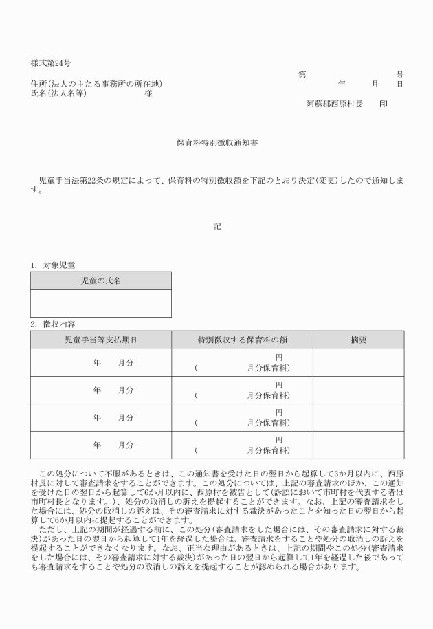 (1) 様式第24号の保育料特別徴収通知書(以下「特別徴収通知書」という。)を作成し、徴収対象者に予め送付すること。