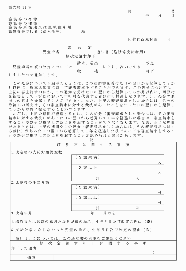 第11条 規則第2条第3項の請求書(以下「額改定認定請求書(施設等受給者用)」という。)の提出を受けたときは、第9条第1項各号の規定の例により処理するものとする。