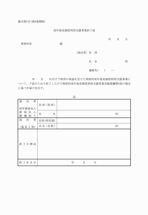 第9条 認知症高齢者等の成年後見等が終了した場合は、当該認知症高齢者等又はその成年後見人等であった者は、その旨を村長に成年後見制度利用支援事業終了届(様式第5号)により届け出なければならない。