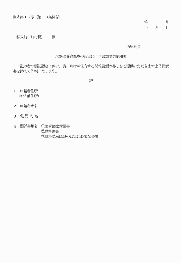 3 村長は、同意書の提出があった場合、転入前市町村長に対し、未熟児養育医療の認定に伴う書類提供依頼書(様式第15号)に同意書を添えて、書類の提供を依頼するものとする。