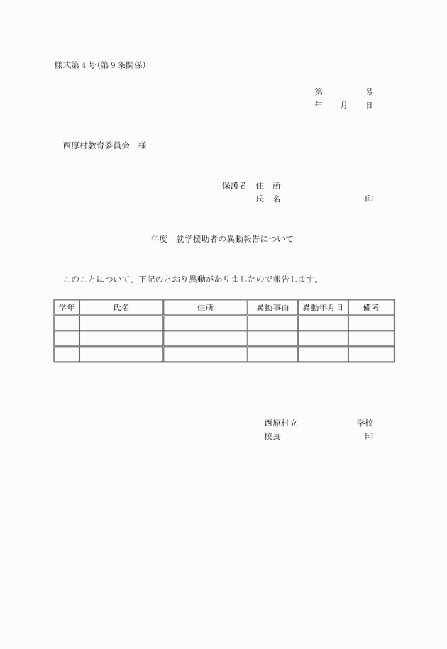 第2条 就学援助費の支給対象となる者は、西原村に住所を有し、西原村立の小学校又は中学校に在学する児童又は生徒の保護者(区域外就学者については、この限りでない。)で、次の各号のいずれかに該当するものとする。