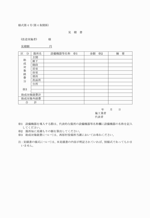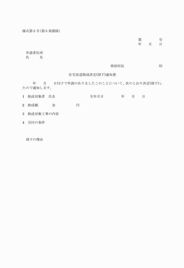 4 村長は、前項の規定による助成金額の通知をもとに、改造実施者から助成金請求書(村長が別に定める)の提出があったときは、当該助成金を支給するものとする。
