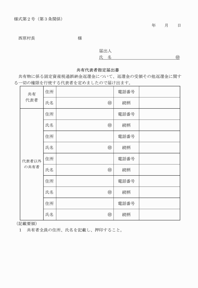 第7条 支払対象者が、返還金の支払を受けようとするときは、村長に対し固定資産税過誤納金返還金支払交付申請書(様式第4号)を提出するものとする。