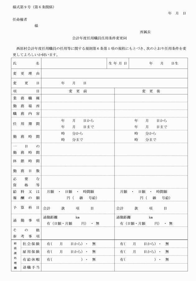 第7条 西原村職員の服務の宣誓に関する条例(昭和35年西原村条例第7号)第2条第2項の規定に基づく会計年度任用職員の服務の宣誓については、署名した宣誓書の提出によるものとする。