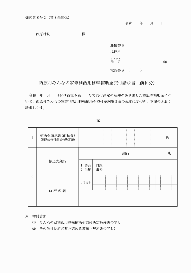 第12条 みんなの家等利活用移転補助金交付予定者は、対象工事が完了したときは、速やかに次に掲げる書類を西原村長に提出しなければならない。