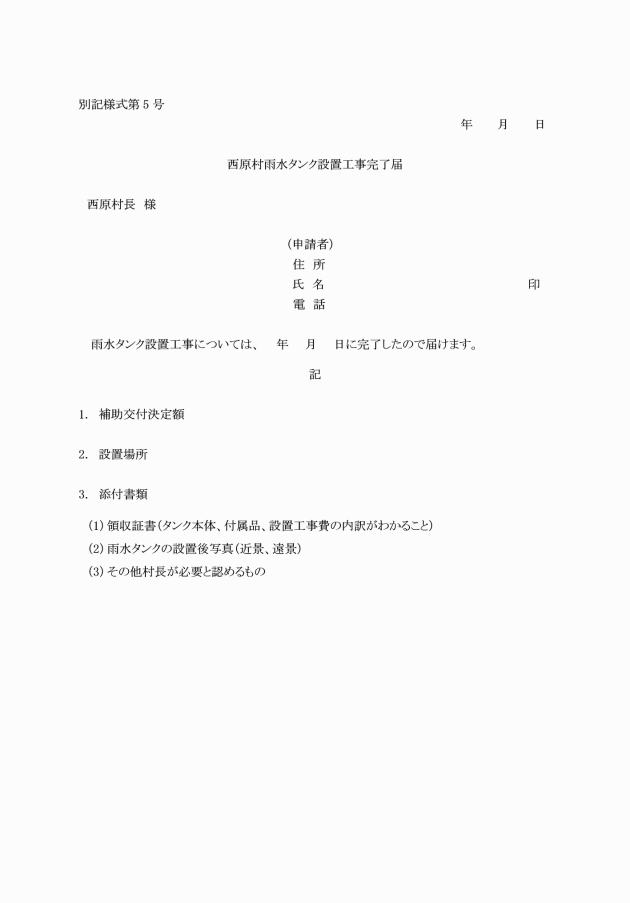 第9条 補助金交付決定を受けた者は、工期内に雨水タンクの設置後速やかに西原村雨水タンク設置工事完了届(別記様式第5号)に次に掲げる書類を添えて村長に提出しなければならない。