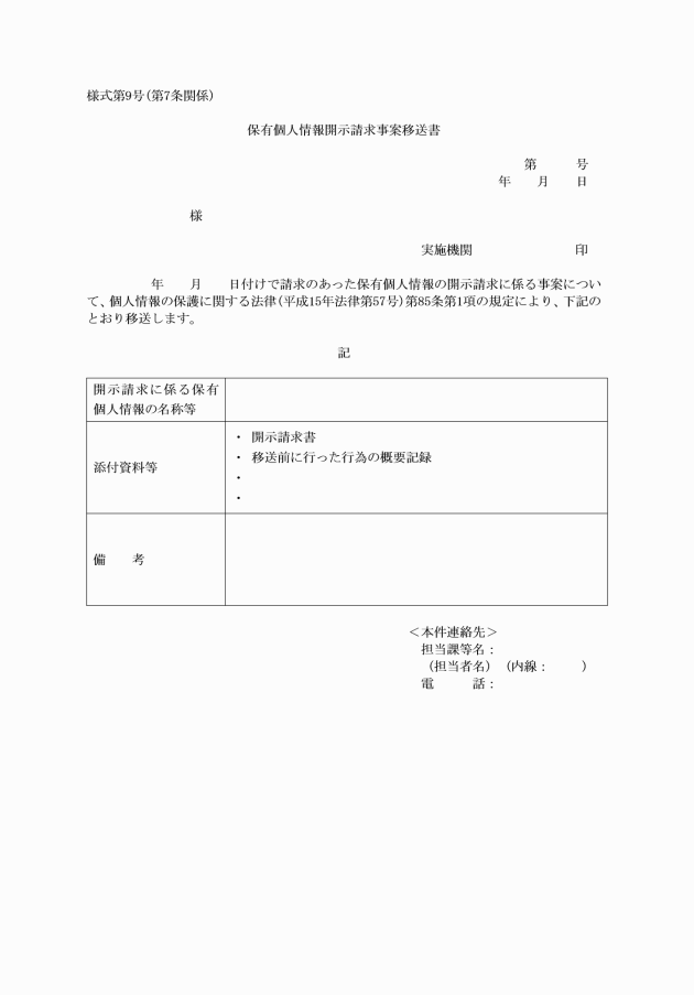 第7条 実施機関の長は、法第85条第1項の規定により事案を移送する場合は、移送をする他の行政機関の長等に対して、様式第9号(保有個人情報開示請求事案移送書)を交付するものとする。